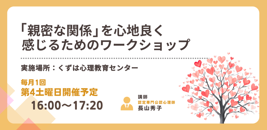現在くずは心理教育センターをご利用中の皆様で、親・兄弟姉妹・パートナー・友人関係など「親密な関係」において、悩み苦しんでおられる方々にぜひ参加していただきたいプログラムです。5回の連続講座ですが、どの会に参加されても大丈夫です。左画像をクリックしていただくことで詳細ページに移動します。