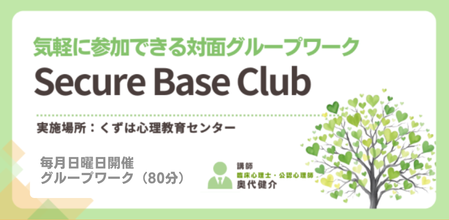 同じ悩みを持つ人たちとつながりたい、人との関わりをもっと前向きに楽しみたい――。そんな思いを大切に、Secure Base Club(安全基地クラブ)では安心して語り合い、学び合えるグループワークを開催いたします。人との関わりが苦手だけど練習したい――。そんな方も大歓迎。一人ひとりのペースを大切にしながら、安心して話せる・聞ける時間を提供します。